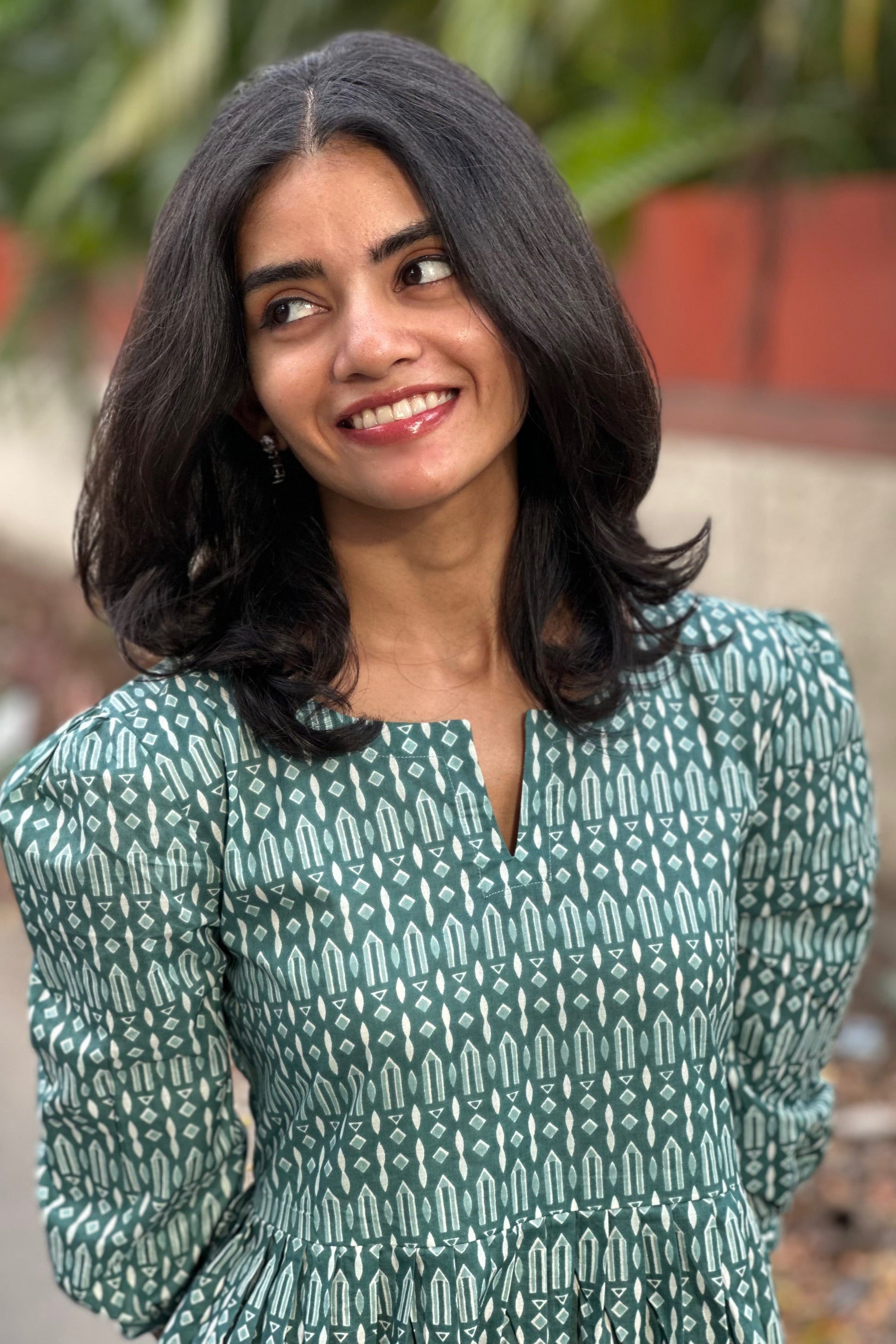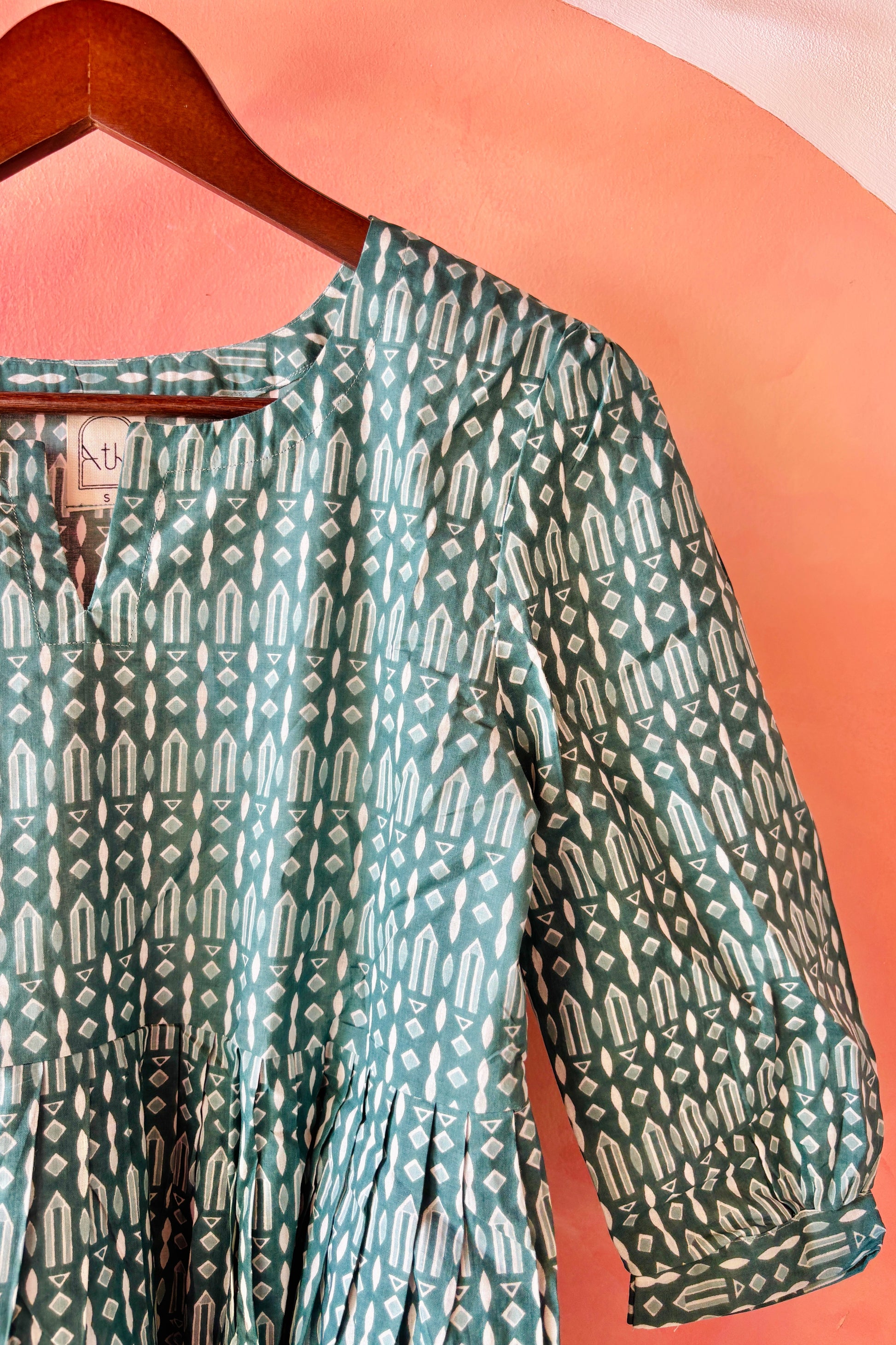 Light and elegant, green geometric print dress is perfect for your casual outings/ special occasions. It's breezy soft cotton fabric and floral prints offers both style and comfort.