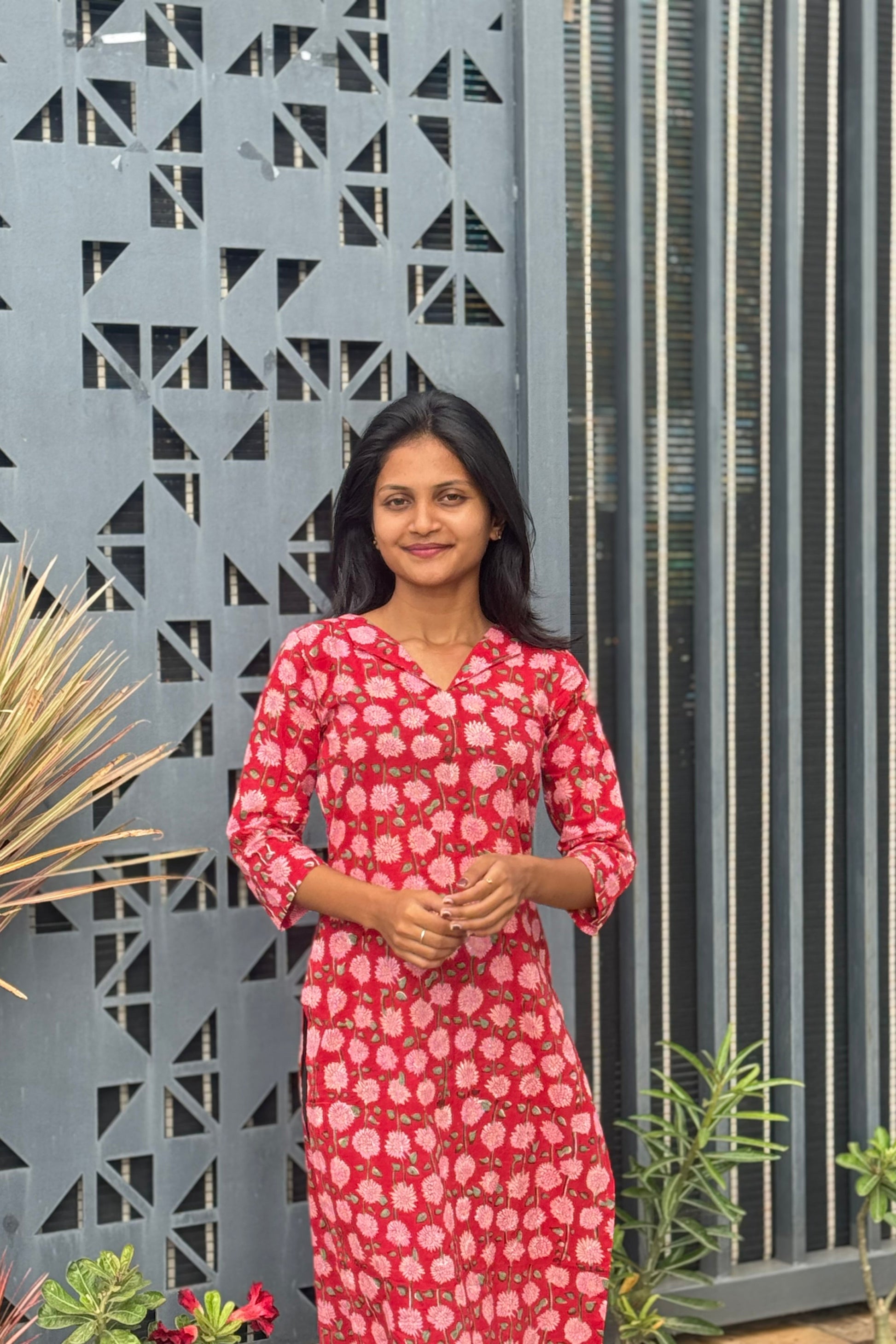Elevate your wardrobe with this bold red floral printed kurta. Made from soft cotton fabric, the kurta features beautiful block prints that adds a vibrant touch. Pair it with your favourite bottom for a chic look.